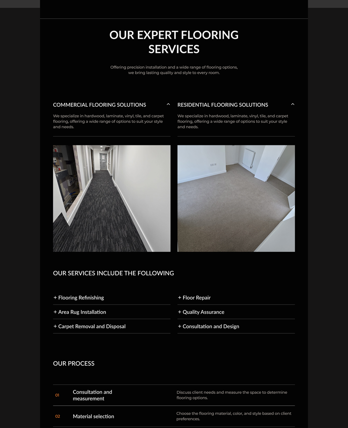 I designed the full website and visual identity for Jules Flooring Ltd, a flooring services company. The project focused on building a modern, professional interface with a dark theme and orange highlights, showcasing services, trust signals, and clear calls to action for client inquiries.